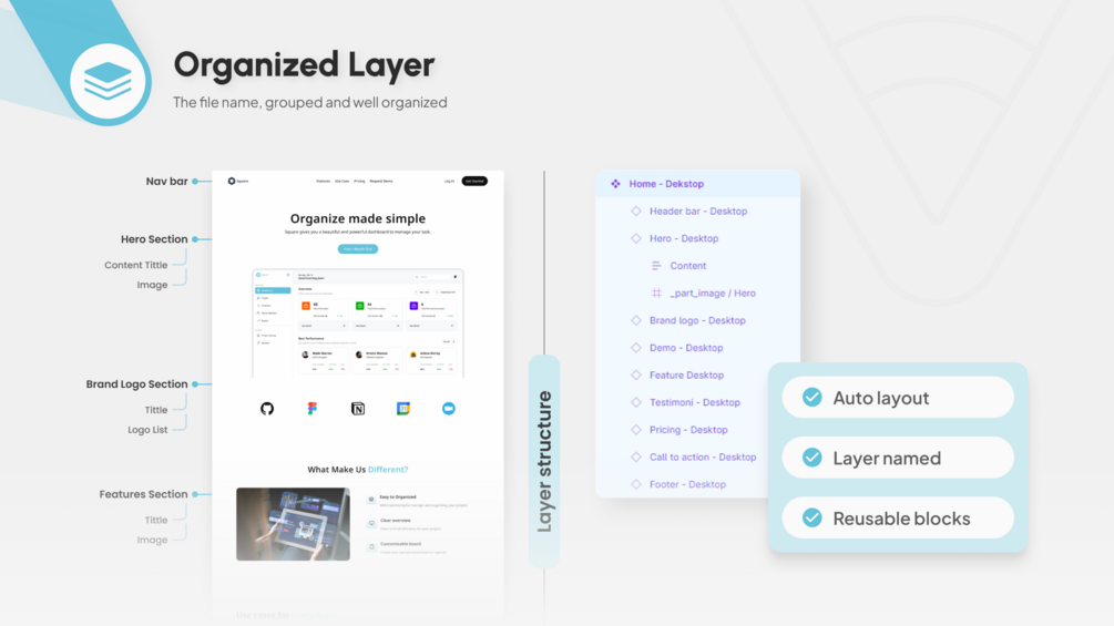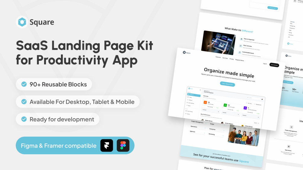 Create a professional landing page for your productivity software with our customizable template and UI kit. Seamlessly integrated for desktop, tablet, and mobile with Figma and Framer, it offers over 100 reusable blocks for unlimited creative possibilities. Development-ready and Framer-compatible, it ensures a smooth build process for a live, functional page.