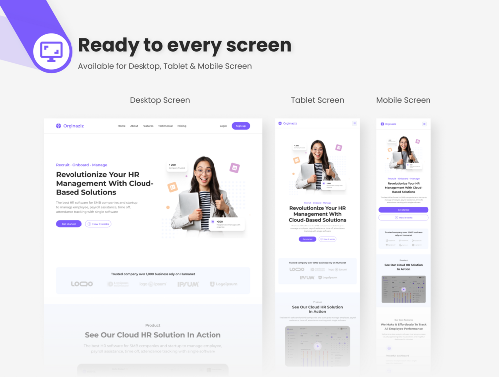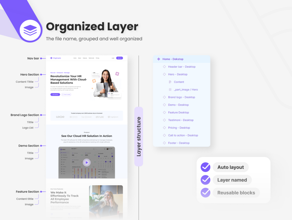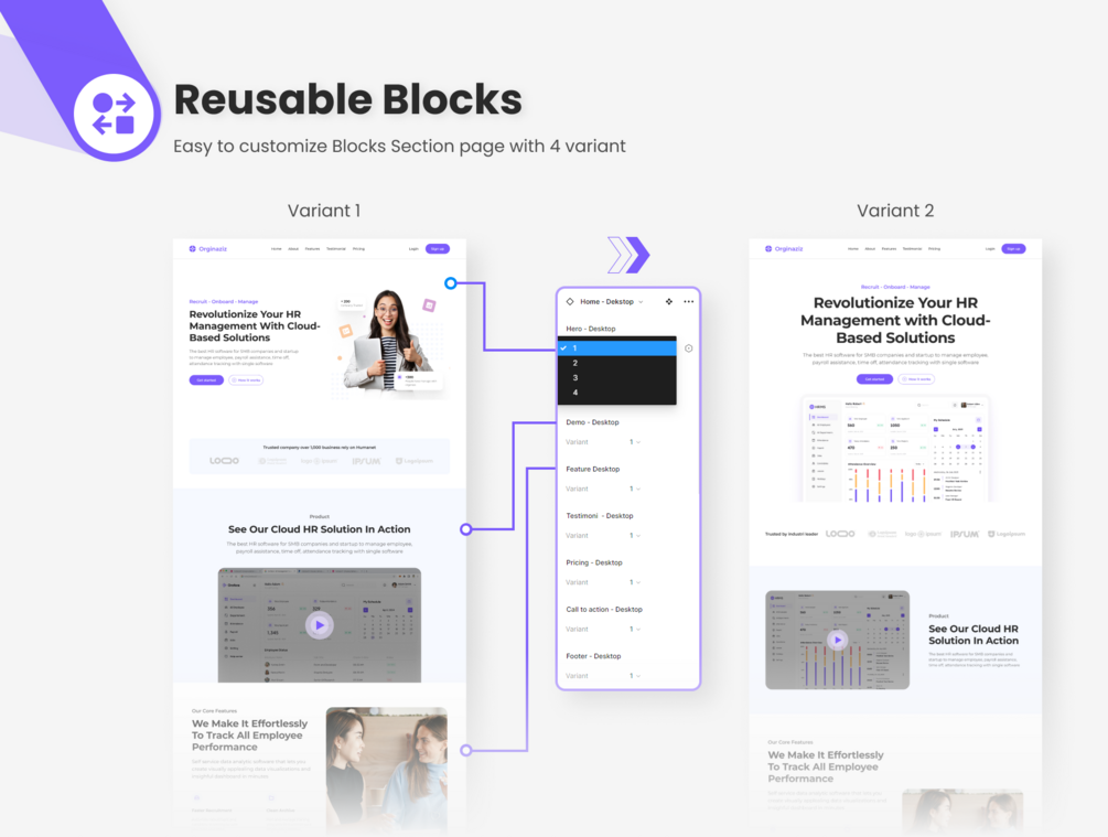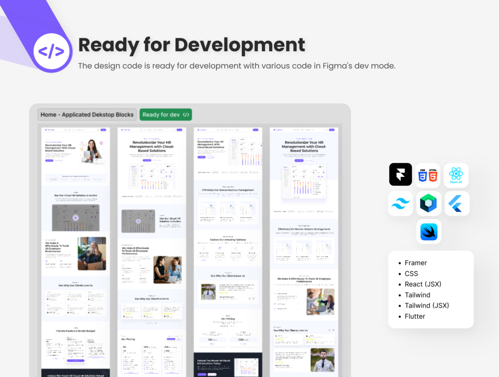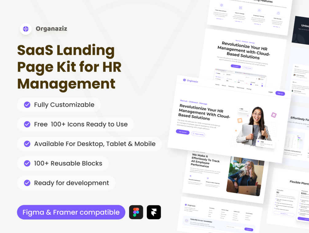 Landing Page Template & UI Kit for SaaS HR Management offers a fully customizable solution designed for seamless integration on desktop, tablet, and mobile devices. Designed using Figma and Framer, and featuring over 100 reusable blocks, it provides limitless creative possibilities. Ready for development and fully compatible with Framer, this template ensures a smooth and efficient build process, allowing you to create a professional and functional HR management SaaS landing page that can be easily turned into a live version.